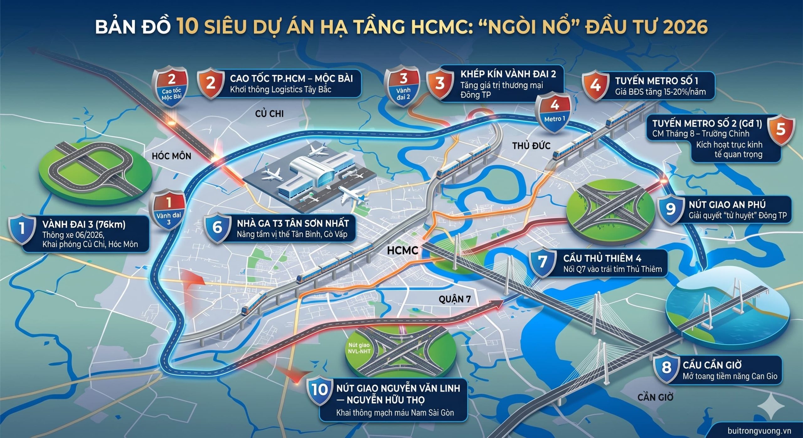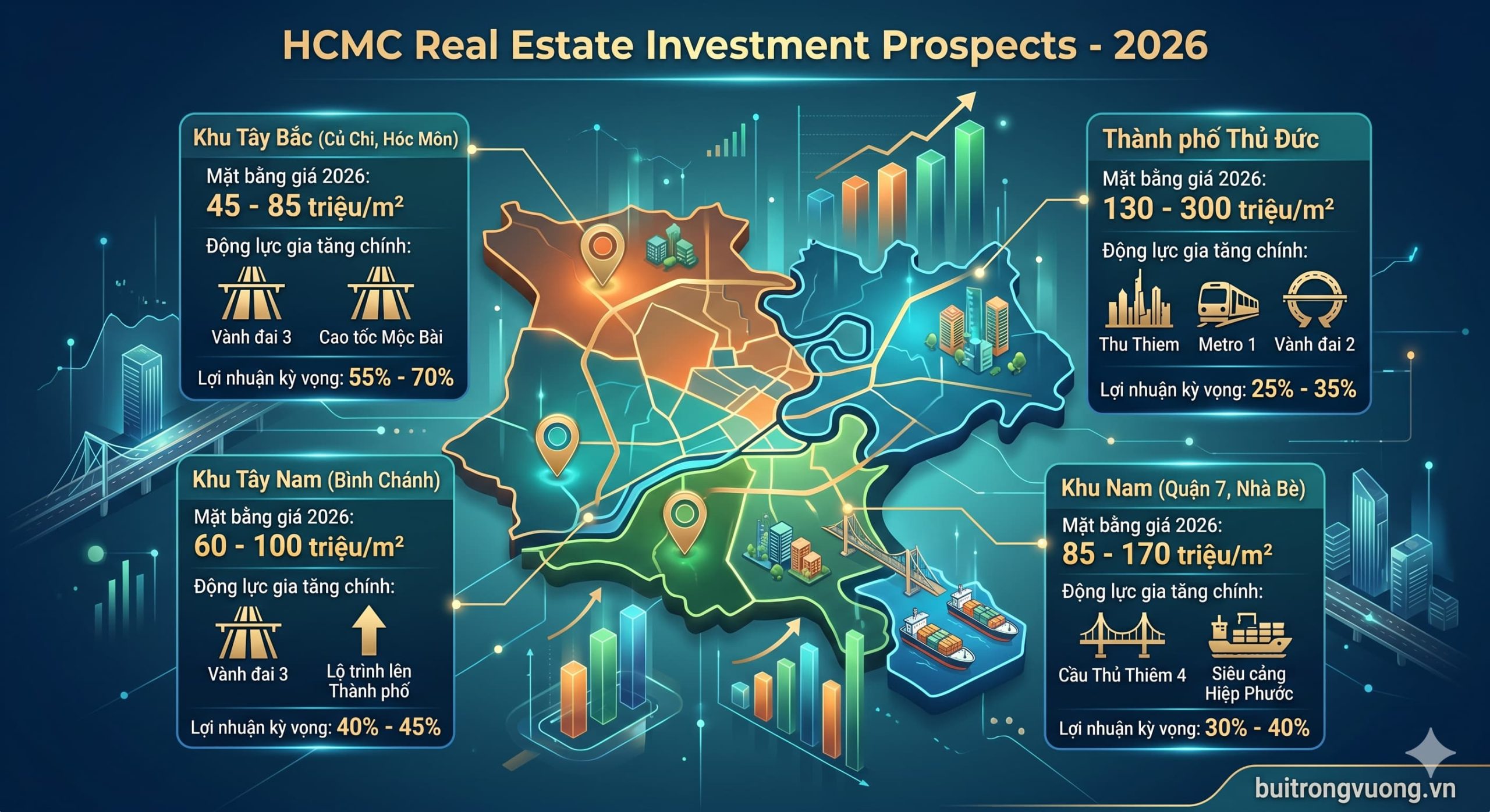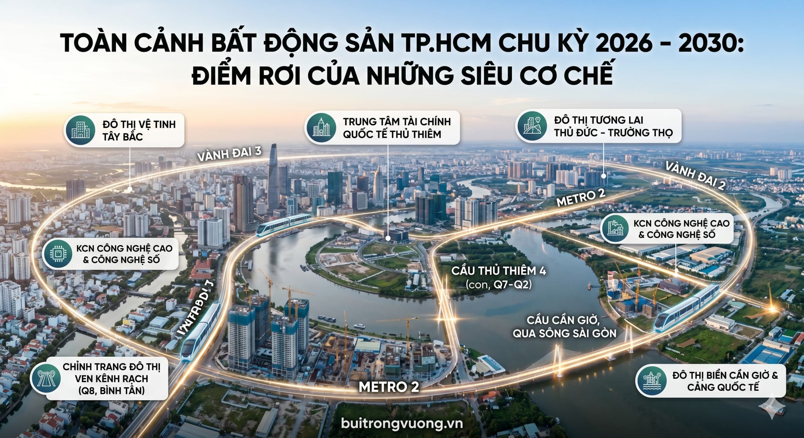 BĐS TP.HCM chu kỳ 2026-2030. Phân tích tác động Vành đai 3, Metro số 1 & bảng giá đất mới. Chiến lược đầu tư thực chiến từ Bùi Trọng Vương.