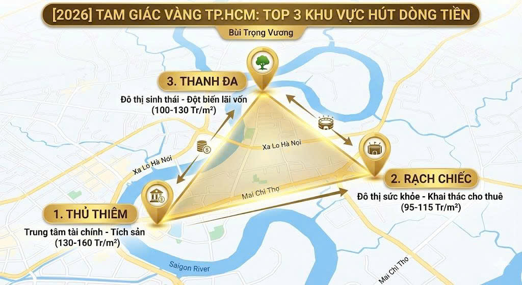 Tôi là Bùi Trọng Vương. Với hơn 20 năm kinh nghiệm quan sát các chu kỳ biến động, tôi nhận định có 3 khu vực sẽ trở thành “trọng điểm” thu hút dòng tiền mạnh nhất, tạo nên thế chân kiềng “Tam Giác Vàng” vững chắc cho tương lai TP.HCM vào năm 2026.